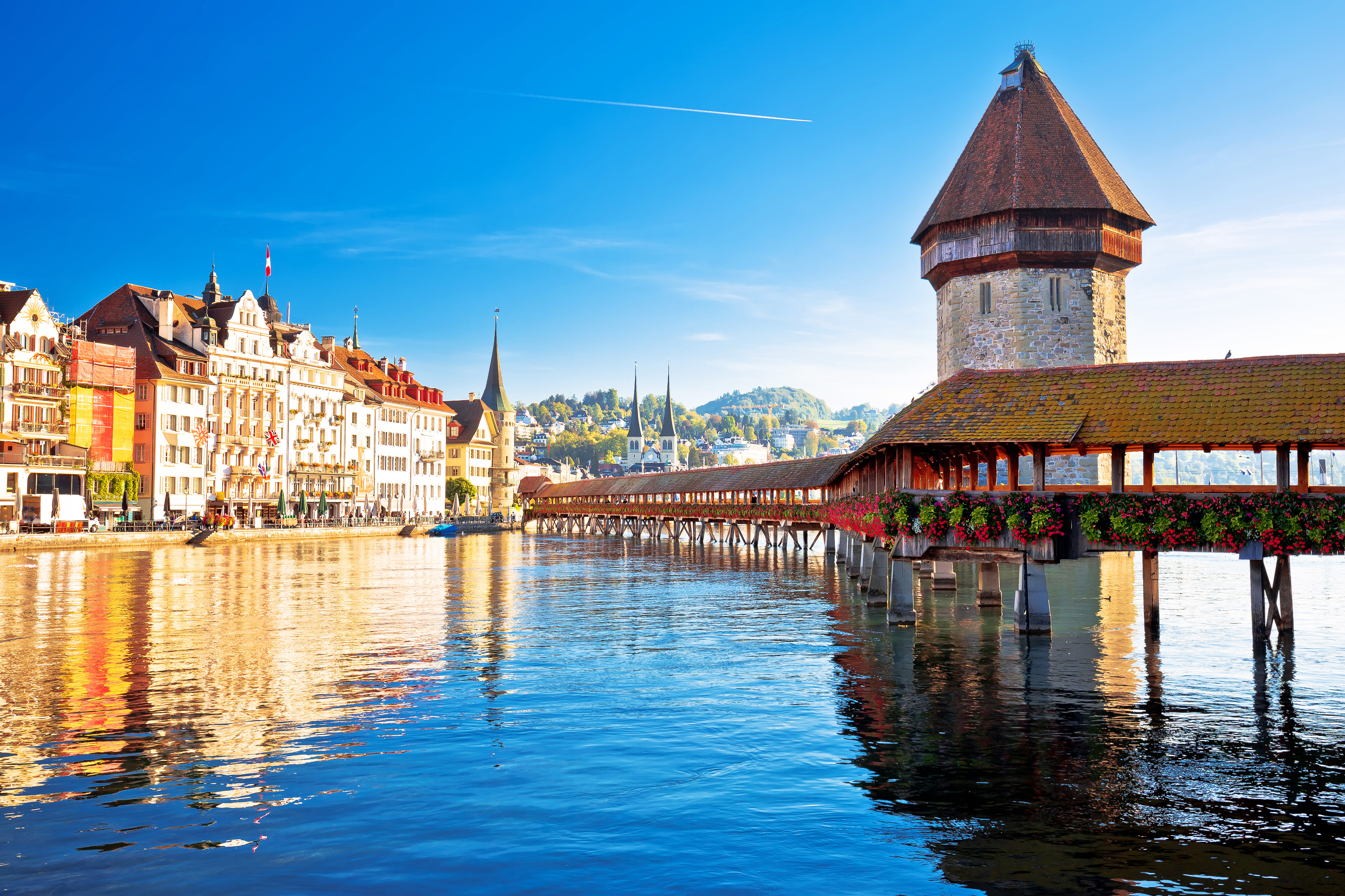 Famous Chapel Bridge in the historic city center of Lucerne, the city's symbol and one of Switzerland's main tourist attractions and views on a sunny day in summer, Canton of Lucerne, Switzerland