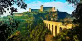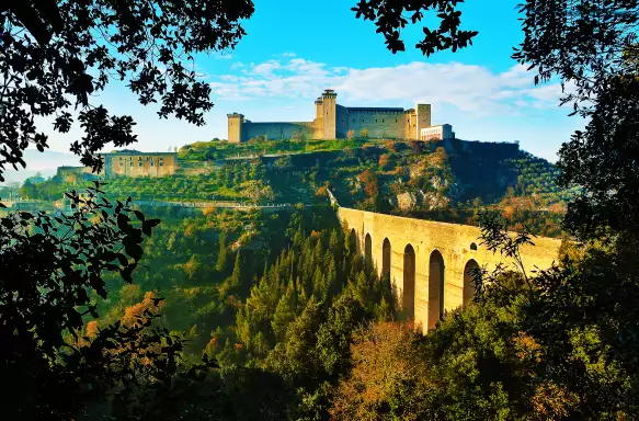 We'll start with a journey to Spoleto for a guided tour. Nestled in the foothills of the Apennine Mountain range, the view of its medieval arched bridge leading to the impressive Rocca Albornoziana fortress seems straight out of a historical film. The city behind reflects the influences of both Roman and Lombard rule. The ruins of the ancient Roman amphitheatre contrast with the Romanesque cathedral that shines in pale stone on the Piazza del Duomo.