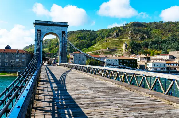 After breakfast, we’ll visit Tournon and Tain l’Hermitage. Resting on opposite banks of the mighty Rhône, Tournon and Tain‑l’Hermitage form one of the loveliest pairings in the northern Rhône Valley – two distinct yet deeply connected towns, linked by bridges, history and world‑class wine. In fact, a stroll across the pedestrian suspension bridge, the Passerelle Marc Seguin, offers effortless access between the two, making it easy to explore both sides during your free time.