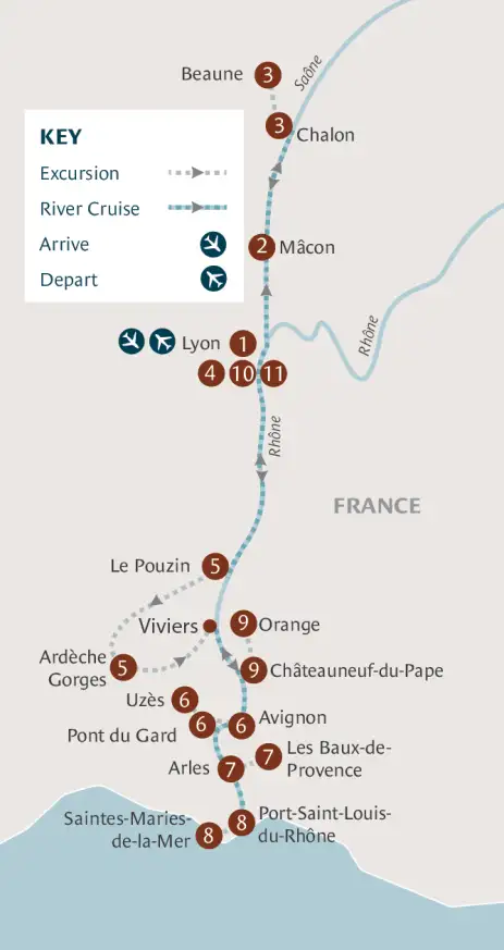 - Discover your destinations on eight guided tours including Cluny Abbey, Beaune, Lyon, Avignon, Uzès, Arles, Orange and Saintes-Maries-de-la-Mer.