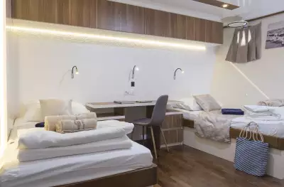 The Cabin features twin beds, which can be configured as double, and a desk and chair.