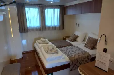 The thoughtfully-designed fully air-conditioned cabins are all equipped with desk and chair, wardrobe, safe, hair dryer and bathroom with shower and contemporary fittings so your comfort is assured. Free Wi-Fi is available throughout.