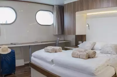 The upper deck holds two category A+ cabins and the simple yet elegant restaurant where you can dine in a comfortable and informal atmosphere. The fully stocked bar extends into the all fresco area at the stern of the ship.