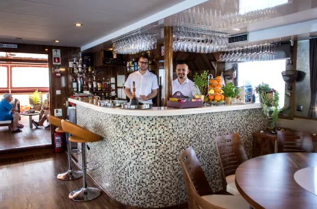 On the ‘Captain’s Dinner’ night, savour specially selected dishes for your enjoyment. After indulging, visit the fully stocked bar that extends into the al fresco area at the stern, providing a relaxed setting for drinks. Whether inside or outside, the restaurant ensures a delightful dining experience, combining comfort, style, and a taste of the region.