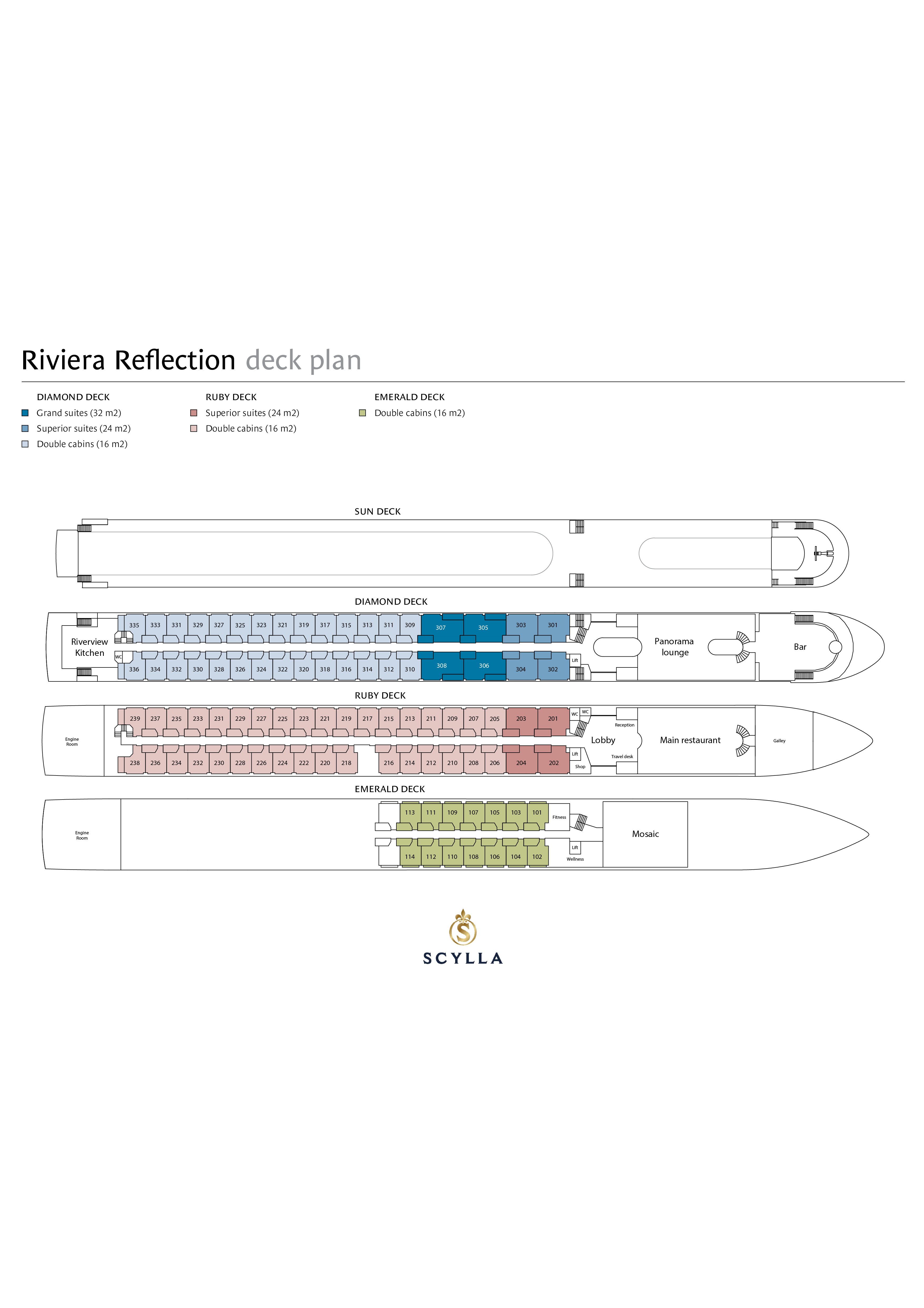 All Grand Suites are located on the Diamond Deck, along with a number of Superior Suites and Double Cabins.