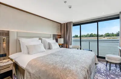 Experience boutique-style luxury in our Double Cabin, featuring a French-style balcony, panoramic sliding glass doors and a mini fridge.